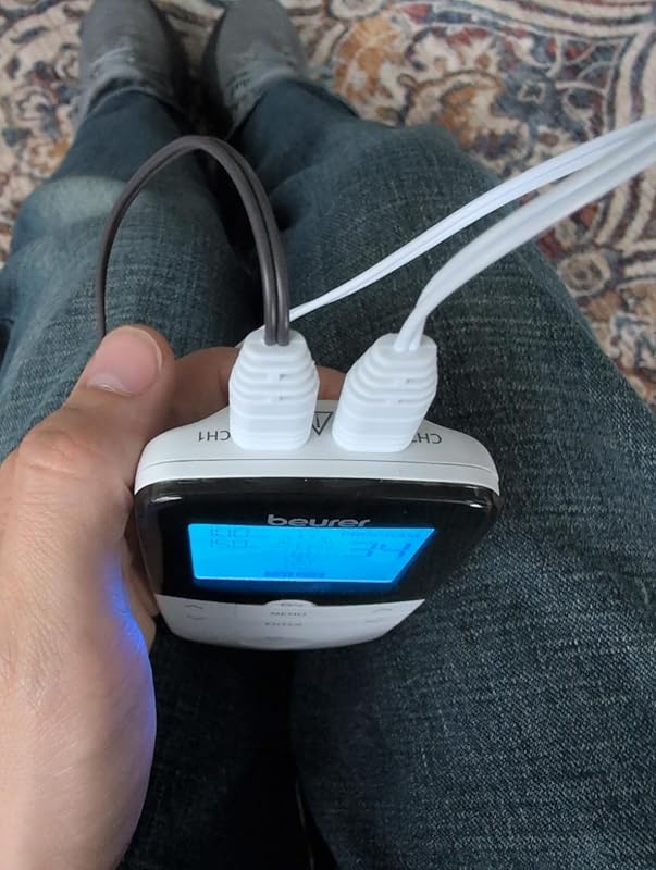 TLDR: Weak battery life, need to recharge after every session. The heat is what makes this worth the extra price. But for the money, the best TENS machine on Amazon that I have found is https://www.amazon.com/dp/B07C4ZXMR3 (I have bought five across the US/UK – they have the same brands on both).In the US I have bought three models of TENS/EMS machines. If you have bad knees/joints/back, this is great as it has heat and it is worth it for that…I have bad knees and they love this.That being said, the battery life lets this down. I use it on my calves and then my knees for a half an hour each, and it needs recharging the next day. The model I like more lasts over 10 days on the same routine of an hour use every night.Also finding gel replacement squares for this is almost impossible. I can’t find them on Amazon or Ebay. They lose their stickiness very quickly even with proper cleaning of the area they will be used on. *Pro tip to fix this, dot some water on the pads, and blow on them to dry, or let them sit out, this will help make them last. That’s another pro of the other model…when the pads wear out and you can’t do the water trick, you can throw them out and replace them easily.Another issue is that the pads on this are just small squares. The other model, I bought these very long rectangles and that size makes a huge difference for EMS.It does have a nice clip that works when I want to put these on my knees and hit the treadmill. It’s secure to my leggings and doesn’t fall off.All in all this is a great option IF you need the heat. Otherwise, get the model that is under 50 bucks, it’s stronger, has a super long battery life, there are a lot of cheaper/larger replacement pads…and this Beurer doesn’t have any of that.