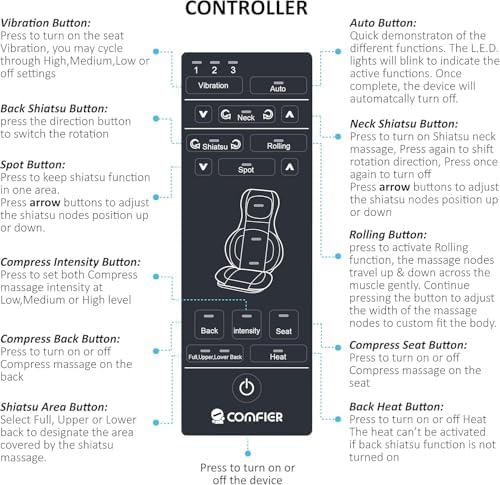 About this item 100% Leather MULTI-AREA MASSAGE EXPERIENCE- The massage chair combines Shiatsu, Kneading, Rolling, compression,Kneading,Rolling,Vibration and Heat functions to help you relieve daily muscle tension and stress. SHIATSU NECK &BACK MASSAGER-Comfier Seat Massager has 4 Shiatsu nodes for neck and back massage,the shiatsu balls position can be adjusted to meet specific user. The chair massage cushion has 4 shiatsu massage nodes that cover the whole back to deliver deep tissue kneading massage for back muscles relaxation. OPTIONAL HEAT, ROLLING & SPOT MASSAGE – The electric chair massager provides optional heat settings to provide soothing warmth to loosen stiff and tired muscles. The rolling massage setting gently slides along the spine to eliminate muscle tension throughout the back. Spot massage allow you have a more targeted massage by focusing the 4 rolling nodes to specific body areas. ADJUSTABLE COMPRESSION- compress massage with 3 adjustable intensity on waist and hips helps relieve tension indulging yourself in full-coverage. Opt for a full back, upper back or lower back then combine with compression massage and heat to create a fantastic relaxing massage.Compression provides a gentle squeezing sensation rather than kneading massage. ULTIMATE COMFORT -Strap the Comfier Shiatsu massager to your favorite chair, or put in on any sofa,couch,recliner, office chair to get the ultimate comfort seat at home or in office. Dual-Zone Compression Massage with One-Touch Firmness Control: Independently activate the compression cushions for your lumbar and seat areas using the separate “Pressure Back” and “Pressure Seat” buttons. For a complete massage experience, ensure both functions are turned on. A single “Pressure Intensity” button then allows you to customize the firmness for both zones simultaneously across Low, Medium, and High levels. Customizable Neck Massage for Most Users (Approx. 5’3″–6’0″)– Enjoy a tailored massage every time. Simply press & hold the remote button for 3 seconds to move the nodes up or down until they fit your exact neck and shoulder height. Perfectly designed for users 5’3″ – 6’0″.For users under 5’2″, placing a seat cushion or pillow is recommended for better alignment.