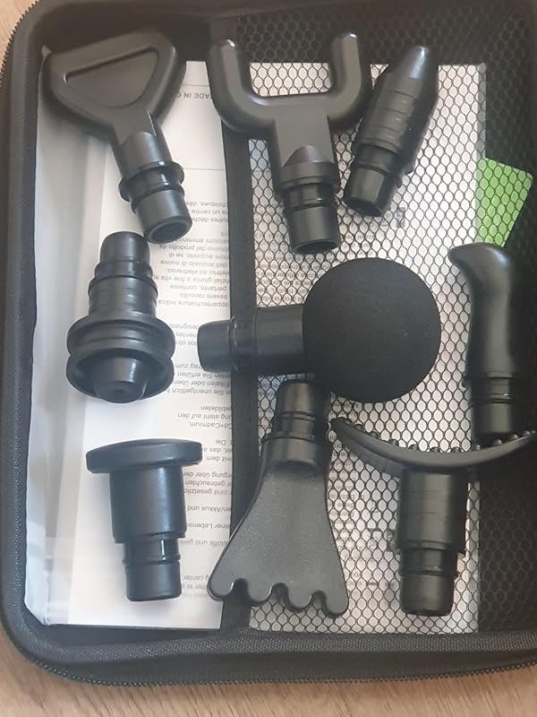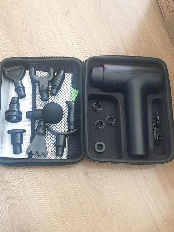 Having been going to the gym more recently, something that people forget to remind you on is how sore you can be after workouts, this is called DOMS or Delayed Onset Muscle Soreness and it’s something that can really hinder your day to day. However a massage gun is something that really helps reduce this/ stop it happening all together.This massage gun comes in a handy carry case alongside a number of different attachments. These attachments are used to hit small areas, larger areas or run along edges of muscles to get a deep and intense massage. My personal favourite is the fork shaped one as you can get really good isolation of the muscle and run along the ridge line of it to get a penetrating massage which really reduces the DOMS in my legs.The massage gun itself has a number of speed settings on the back which go up in intensity. These start of slow and ramp up to speeds I am yet to get anywhere near. The 3-5 mark is where I get the best results at the moment but I have gone higher when going for a single spot as to not make it sore.The gun is made of solid plastic, this plastic has no sharp edges, rough spots and uneven areas. Just a well made massage gun design. The gun is weighted nicely because of the large battery inside of it. This is likely held in the handle which gives it a nice balance. The battery so far has been more than long enough for all my massages and I have not yet needed to charge it from it’s initial charge.Overall, this massage gun has been great. The performance has been excellent and I have been able to train harder and more often without really worrying about being super sore.this massage gun packs a lot of value into a very low cost! 5/5!