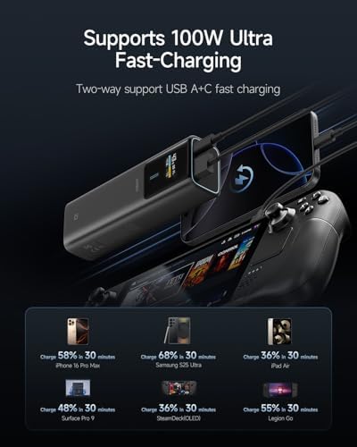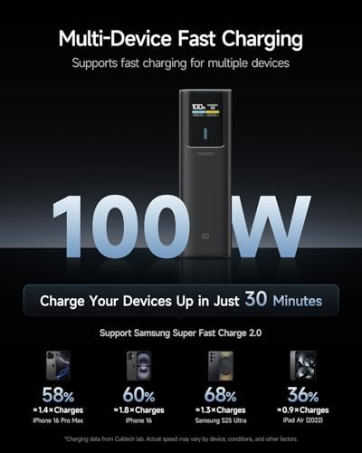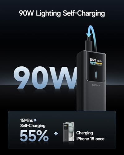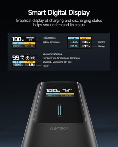 About this item 【100W Maximum Ultra-Fast Charging】Equipped with a USB-C port output, CUKTECH NO.10 power bank offers an incredible 100W MAX power for laptops, up to 30W MAX for iPhones, and 45W MAX for Samsung Galaxy devices. It’s the ideal solution for rapidly charging most of your devices and is extremely convenient to carry around, ensuring you’re always powered up on the move. 【Real-Time Smart Display】Featuring a color TFT display, this cutting-edge system provides real-time monitoring of voltage, current, power output, battery level, and remaining time until full charge/discharge. So you can stay in control and make informed decisions about power banks. 【90W MAX Rapid Self-Charging】Always Ready, Always Reliable. Get to 55% capacity in just 15 minutes—sufficient to fully charge an iPhone 15. Ideal for travelers, busy professionals, emergency situations, and more. 【Wide Compatibility, Enhanced Safety】Our CUKTECH power bank is compatible with a variety of fast-charging protocols, including PD, PPS, QC, FCP, and SCP, ensuring broad support for most of your devices. With a VO fire-resistant shell and nine layers of protection, this portable power bank meets safety certifications such as UL, CE, CB, and FCC, providing a superior and secure charging experience. 【High-Power, Lightweight, and Compact】Strike the perfect balance with our power bank, combining high power with a compact and lightweight design. Weighing only 10oz and sized like a large energy bar, this power bank is a convenient companion for on-the-go use. (Tips: For optimal charging speeds, use a charger that delivers a minimum of 90W, supports Power Delivery (PD) protocols, and pair it with the included 6A cable.)