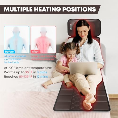 About this item Adjustable Massage Modes: 3D shoulder and neck massage, adjustable mode and intensity, with one-click on/off function, and with forward and reverse rotation. Removable for separate use, bring more convenience and experience to your life! Ultimate Massage Mat Experience: Our massage mat features 10 powerful body vibration motors that deliver soothing vibrations, helping you melt away stress and fatigue after a long day or an intense workout. Choose from 9 modes and 9 varying vibration intensity levels for a personalized experience. Multi-scenario Use: Measuring 66×20 inches, this multifunctional massage mat is perfect for use on your bed, sofa, floor, or chair. Its lightweight and foldable design make storage a breeze, so you can create a relaxing environment anywhere, anytime! Smart Heating Function: Enjoy an upgraded massage experience with 4 built-in heating pads that promote blood circulation and metabolism. With independent heating options and safety features like overheat protection and a 30-minute auto shut-off, your safety and comfort are our priorities. Ideal Gift Choice: Made from soft, skin-friendly materials, our full body massage mat offers a gentle and safe experience. It’s the perfect thoughtful gift for occasions like Valentine’s Day, Christmas, or Thanksgiving, showing your loved ones how much you care through relaxation and comfort.