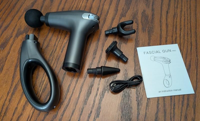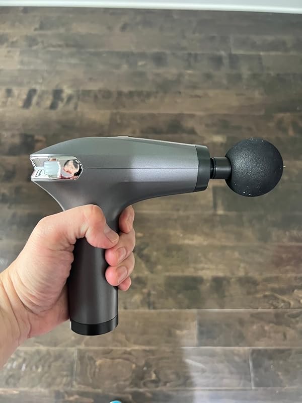 Nice looking massage gun. It also has multiple attachments. They are easy to put on. The motor is quiet. 8 speeds with a digital reading. What i think the best part is the handle. You can dangle this over your shoulder. It very portable. Battery is decent. Do a good job on pain relief.