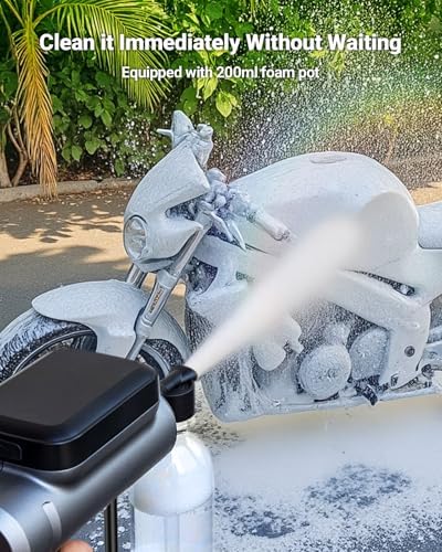 About this object five-in-1 Spray Nozzle: surely rotate the nozzle to interchange between zero° (jet), 20° (ordinary), 20° (angled), 40° (wide spray), and foam modes, best for any cleaning project! SEALIGHT Cordless pressure washer Comes with a 200ml foam pot & soda bottle adapter for wealthy detergent foam, making sure a deep and thorough clean to your vehicle, motorbike, or outside tools.