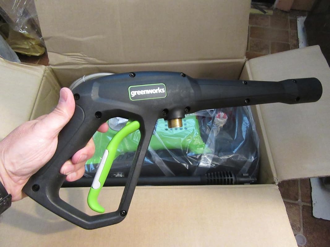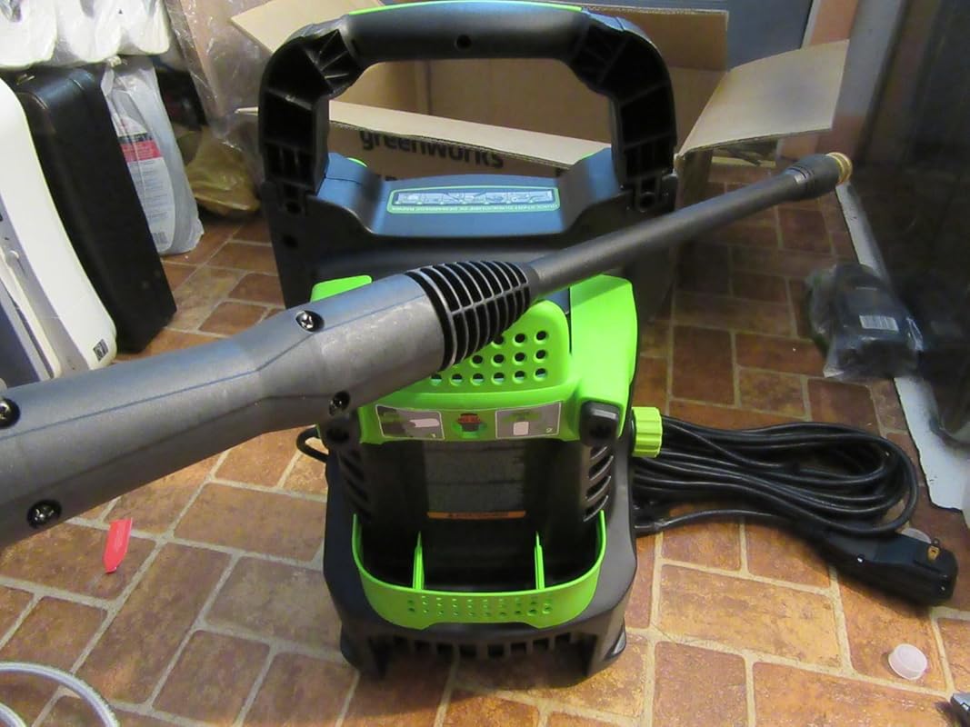 I have a nice, heavy duty Karcher gas power pressure washer that I use around my property. But I don’t like using it in the winter due to the hassle of making sure it does not freeze (and it is too unwieldy to bring inside more than once each year for storage), and it is too large and heavy to take to my alternate property, or for small quick tasks. So I went shopping for a more portable, electric powered pressure washer whose price would not break the bank. I selected this “Greenworks 1500 PSI 1.2 GPM Pressure Washer (Upright Hand-Carry)”; note that the actual manufacturer’s part number GPW1501. At just under $100 US, I was hoping that the quality was at least decent.I was a little surprised to see that this product was made in Vietnam (rather than China or Taiwan), although the Greenworks company appears to be based on Canada, and it appears that service and support is ‘local’, or within North America at least.The basic specifications are:- Pump housing dimensions; 18″ tall, 11″ wide, 9″ deep (front to rear); these dimensions are approximate- Pump housing weight; 19 pounds (according to user’s manual)- Pump maximum pressure; 1500 PSI- Pump flow; 1.2 GPM- Pump power: 120VAC, 60Hz, 13A (this should be plugged into a dedicated 15A circuit, or at least one where there is nothing else on the circuit currently turned on); the power cord is about 35 feet long and has a GFCI plug, so you can use this safely even with non-GFCI outlets; note that the GFCI plug head is pretty huge, so it might not fit into outdoor outlets which have weather-doors, etc; I had to use a short outlet extender cord in order to plug into my house’s outdoor outlets- Handgrip has the usual pressure washer squeeze trigger control, and all high pressure hose and associated fittings are the conventional type used by most other pressure washers; I can use the longer pressure hose, handgrip, and accessories (including the nozzle tips) that are part of my larger Karcher machine when I am using this smaller Greenworks sprayer- High pressure hose is about 20 feet long (product can be ordered with longer hose lengths)- Accessories; 25° (green/narrow) and 40° (white/wide) spray heads/nozzles/tips, and a detergent ‘tank’ (bottle) with associated detergent spray head, and a small wire nozzle cleaning toolAs with any home-use pressure washer, this one is easy to use, even easier than the larger gas powered ones since there is no need to mess with the engine, and THIS one automatically turns the electric pump on and off according to whether you are squeezing the handgrip trigger. Just screw the high pressure hose fittings onto the pump’s fitting and the handgrip fitting, and connect a garden hose to the water inlet connection (which includes a screen), and plug in the power cord. There is a single control on the pump, “OFF/ON” (plus the handgrip trigger of course), so you turn that on, and start spraying. When you release the trigger, the pump automatically stops. When you squeeze the trigger again, the pump automatically starts. When you are done, turn the power switch off and disconnect the garden hose.As with all such pressure washers, you can quickly and easily replace the nozzle/tip according to the need of the moment, since it has the conventional quick connect fittings.Note that the handgrip has its own proprietary quick disconnect fitting where the ‘spray wand’ connects to the handgrip; this is not the conventional fitting, so you probably won’t be able to use spray wands from other kinds of pressure washer with this machine’s handgrip (but you can use other machines’ handgrips with this machine). When you are using the detergent tank for spraying water and detergent, the detergent tank connects to the handgrip in place of the spray wand, using the same kind of proprietary quick disconnect fitting. The conventional quick disconnect fitting is found on the opposite end of the spray wand.I have so far used this sprayer to clean some siding on my house, and to wash my car. It worked fine and exactly as expected. It seems to be of decent quality, and the pump ran surprisingly quiet. I found the automatic start/stop to be a nice convenience (actually, having this feature might save cost since with it, the more common water recirculation valve on the pump is presumably not needed, and there is no worry about overheating).The handgrip trigger has a small piece of plastic that can be used to ‘lock’ the trigger in the OFF position for safety. However, it seems to be easily defeatable, thus is not of much real use. The manual does not describe the intent or use of this safety lock, other that to state that the user might need to move it from one position to the other.I found the power cord length to be very good, but it is a long and THICK cord, and what to do with it when the pump is not in use is the big question. I would have expected the pump body to have an integral pair of hooks, etc; which the cord could be wrapped around for stowage (as on vacuum cleaners, etc), and WHY Greenworks did not provide this is a mystery.I found the included 20 foot high pressure hose to be too short for my trial tasks, so I was happy that I was able to use the much longer hose from my Karcher washer. 20 feet of hose is really short once you actually try to use this sprayer, so I suggest opting for the model that comes with a longer hose. Also, the included hose comes tightly coiled, and I had a hard time trying to train it to relax so I could actually use it. Greenworks makes a similar, and somewhat more expensive, pressure washer which includes a reel for the hose (I did not choose that model since it looked like it made the overall unit too bulky).The GFCI plug does not include a grounding pin, and this is because the product is “double insulated”. I think this is OK.Gripes:- The product overview diagram in the manual lists 14 pieces, but only three numbered arrows actually appear on the diagram, s