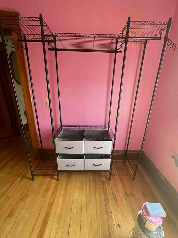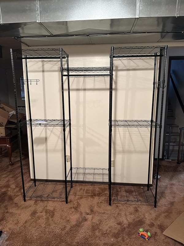 Since my daughter moved back in with me my clothes had to be folded and stored on a folding table. I decided to get this Golpart garment rack and I’m so happy. It was so easy to put together and the functionality is outstanding. I love the mix of the cubes for folded clothes and the hanging parts. There’s even a rack on the side for purses or jackets or robes. The size is large it took up a whole wall practically but I measured carefully before ordering. It makes me feel special and it’s so organized that it helps me in picking out clothes.