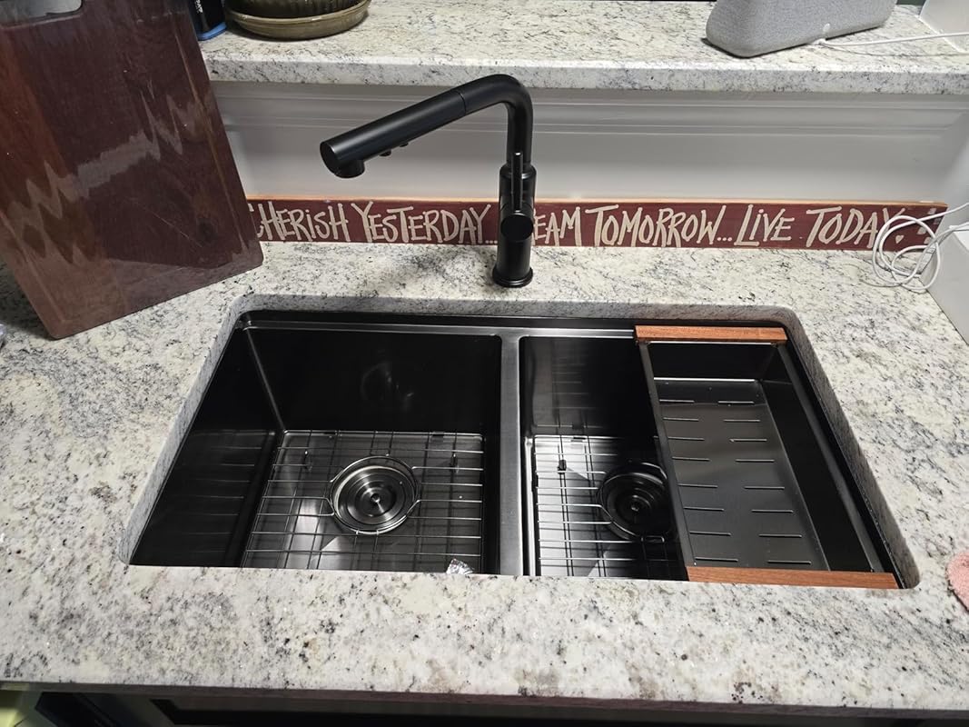 Our laundry room sink had an old fashioned two knob faucet that was 26 years old. Our sink has a cabinet directly above…I couldn’t use the modern “High Loop” faucets that are 16″ or 17″ high from the sink deck. This one is only about 12″ high, and provides all the useful features like a pull out sprayer and 2 settings (spray or stream). The included escutcheon kit allowed me to cover up the three holes in my existing sink and still looks decent. Install was straightforward and solid. Use a tiny bit of silicone grease on the two o-rings in the spout supply line prior to joining it into its female receptacle. It seems to be a nice unit for the price. The real test will be to see how it holds up in long term service.