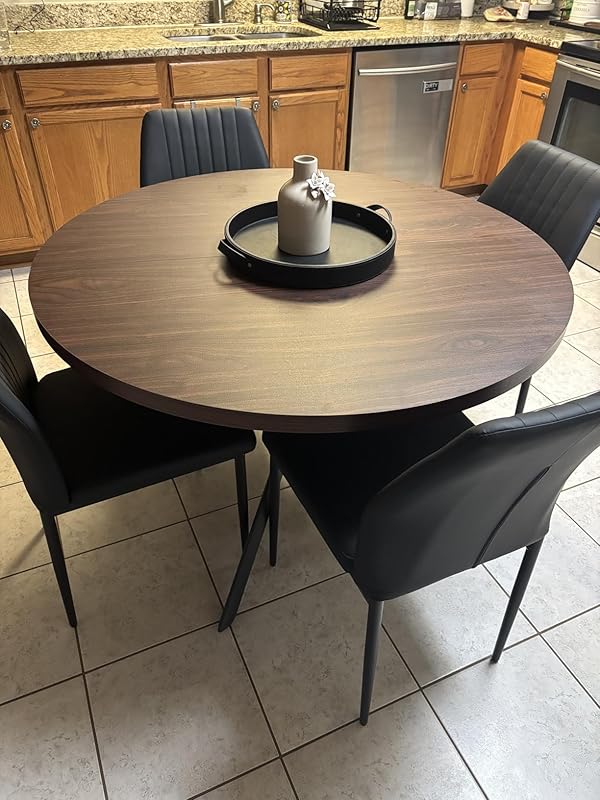 The table and chairs look good in a smaller space and match the design I was going for. Quality could be better but for the price it’s okay. The chairs legs were a bit confusing to put together, but you just have to turn them/switch sides if the screws don’t like up with the holes correctly.