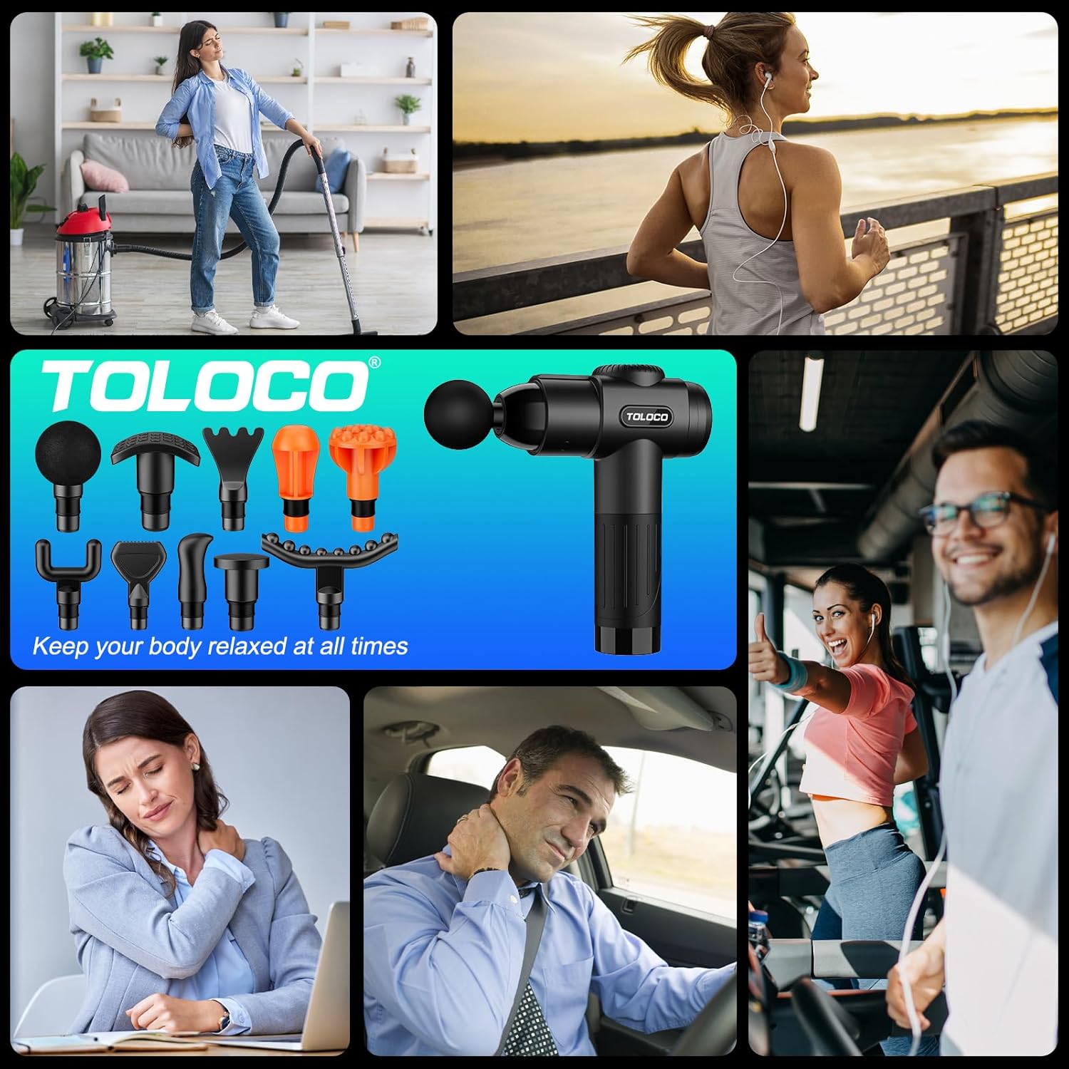 The TOLOCO Massage Gun with 10 Massages Heads is ideal for relieving muscle soreness, reducing fatigue, enhancing flexibility, and supporting faster recovery. It’s a trusted solution for athletes, runners, weightlifters, physical workers, and anyone seeking effective pain relief and relaxation without expensive spa visits.